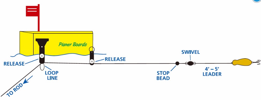 Да, это довольно близко к мотору, но вы удивитесь, сколько рыбы мы ловим таким образом. Он ОЧЕНЬ часто украсит длинные очереди. Чтобы установить его, просто отпустите леску, и когда она достигнет дна, все готово. В зависимости от вашей скорости, он будет тянуть ее на 45 градусов и удерживать приманку прямо над дном (вес на пару футов вверх и на расстоянии 25 футов). При более глубоком погружении вам потребуется больше наматывать, чтобы воблер не подпрыгивал слишком сильно о дно.